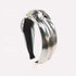 Colorful metallic headband with a unique design on a white background. Knotted pink headband for women with curly hair"